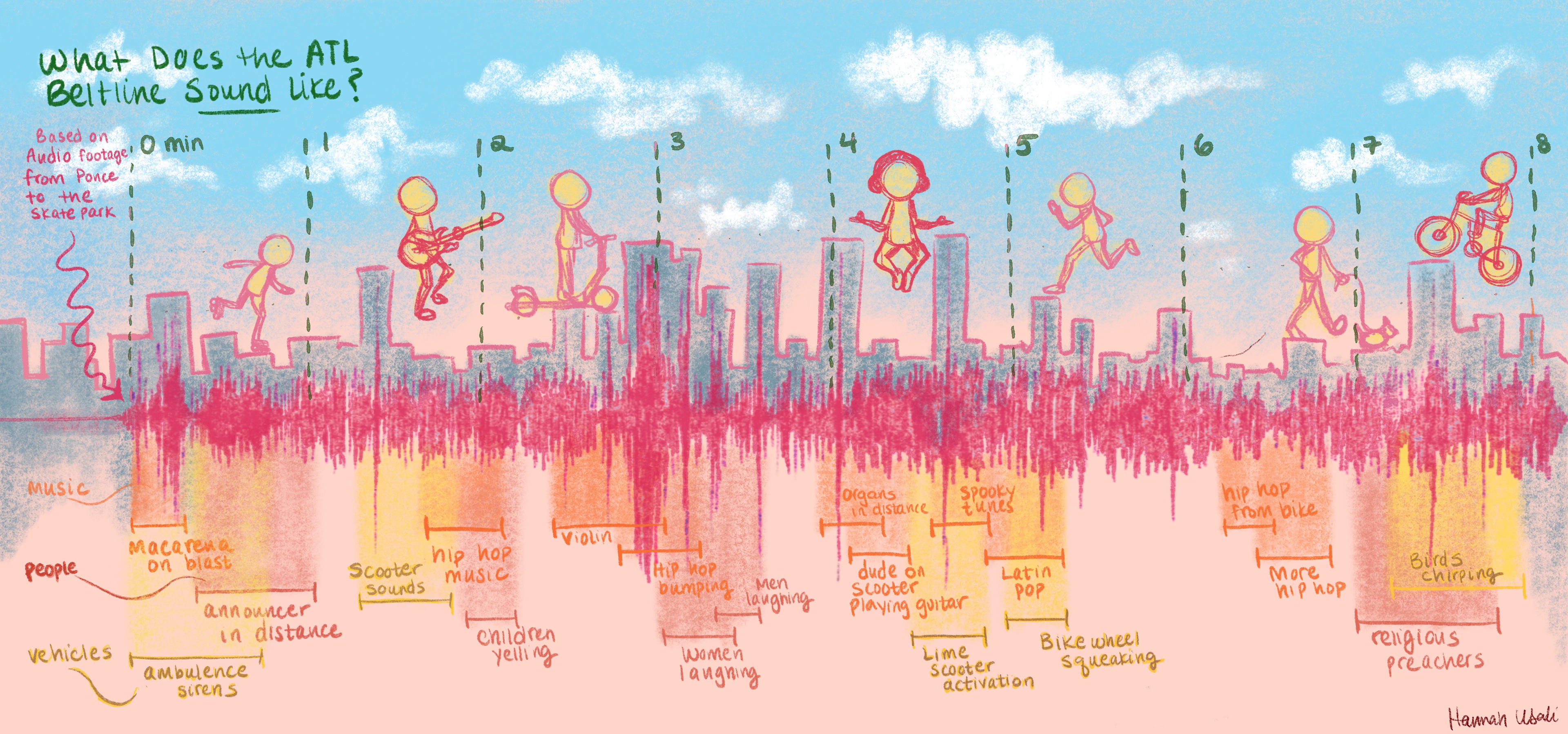 This data visualization translates 8 minutes of audio collected along Atlanta’s BeltLine into a visual profile. Captured from Ponce City Market to the Historic Fourth Ward Skatepark, the soundwaves reflect shifts in pace, crowd density, and atmosphere—revealing the rhythm of a shared public space through sonic data.