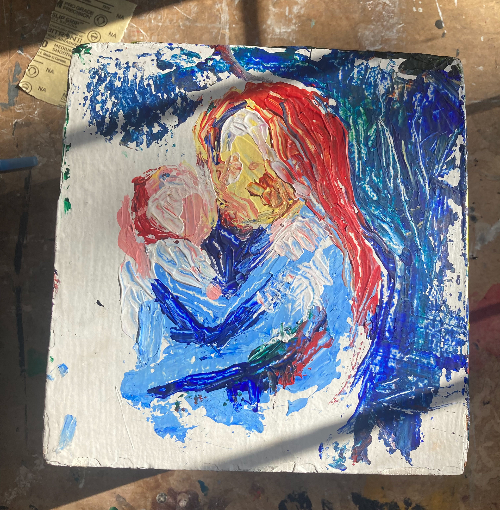 This acrylic painted box is a 3d rendering of the "Parenthood" comic with each panel on a side. Although there is no text, the cube allows the viewer to see 3 panels at a time, more accurately capturing how it feels to recollect a memory. Oftentimes recalling conversation fragments lacks clear sequentiality and is instead heavily composed of clashing visceral emotions.