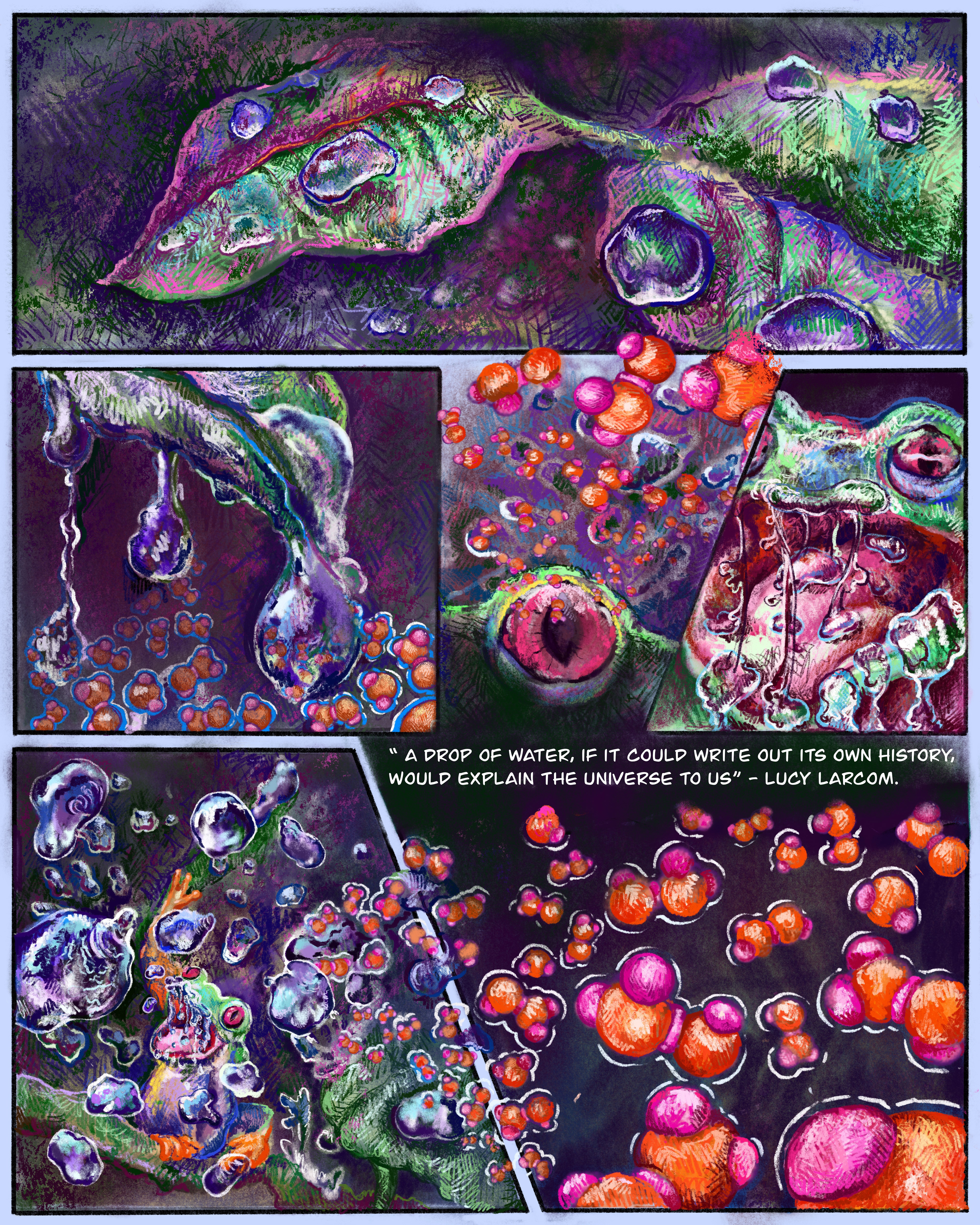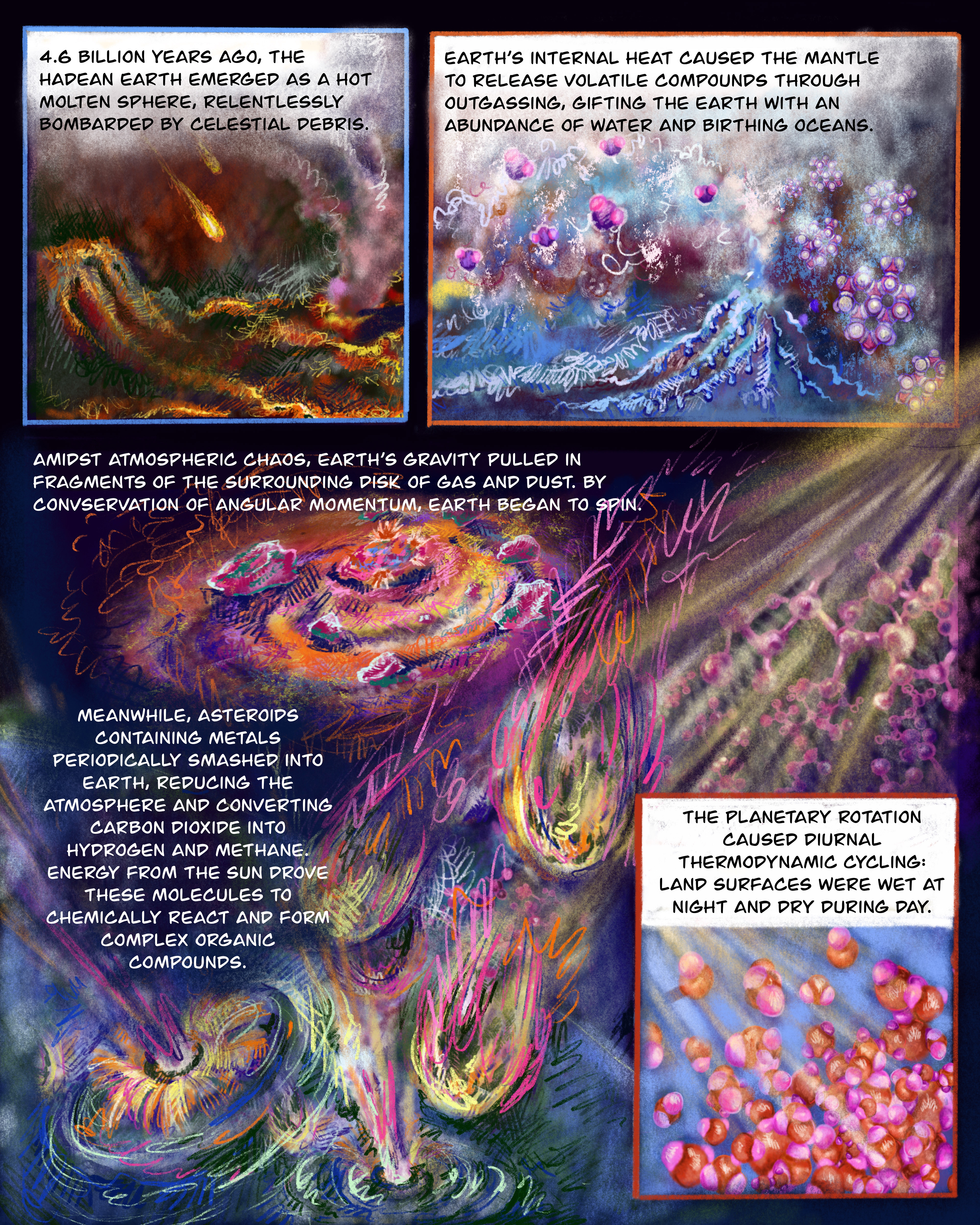 Since October of 2023, I have been collaborating closely with Georgia Tech Professor Loren Williams on a comic depicting the role of water in the origin of life. The comic project presents an opportunity to increase idea sharing amongst chemists, physicists, and biologists.